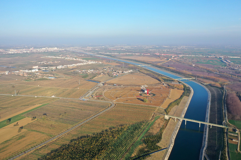 這是2019年12月9日拍攝的河南省南陽市淅川縣九重鎮張河村仁和康源軟籽石榴基地,南水北調中線工程乾渠從田間穿過(無人機照片)。新華社記者 馮大鵬 攝