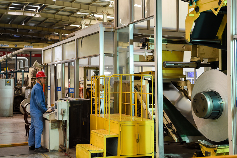在位於山西省太原市的太鋼不鏽鋼精密帶鋼公司,工人在操控寬幅精密帶鋼箔材的加工設備(2020年7月19日攝)。新華社記者 曹陽 攝
