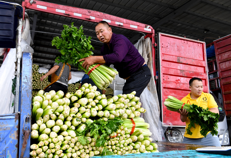 在位於河南省鄭州市中牟縣的河南萬邦國際農產品物流城,工作人員在搬運蔬菜(2021年7月22日攝)。新華社記者 郝源 攝