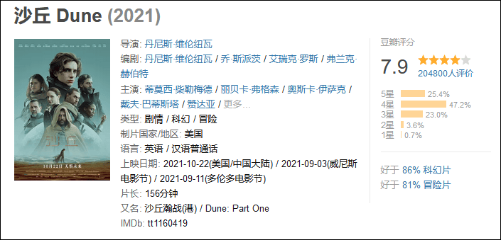 不過,國內觀眾對已登陸內地院線的《沙丘》評價卻褒貶不一。一部分觀眾表示,《沙丘》的觀影過程是一段頂級視聽享受。而也有部分觀眾認為,電影156分鐘的敍事冗長笨重且乏味。目前,該片的豆瓣評分是7.9,貓眼評分也是7.9。另據貓眼專業版數據,上映6天,《沙丘》共取得1.65億元票房,成績平平。