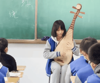 視頻中,王貝爾抱着一把琵琶,依詩中句子為同學們展示着琵琶不同的指法。在她的演示下,同學們不光聽到了什麼是“大弦嘈嘈如急雨,小弦切切如私語”,也見識到了“大珠小珠落玉盤”所指代的輪指。