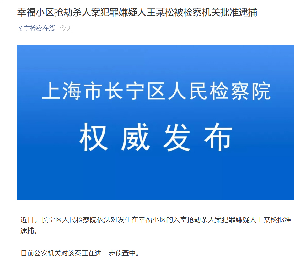 上海長寧幸福小區搶劫殺人案犯罪嫌疑人王某松被檢察機關批准逮捕