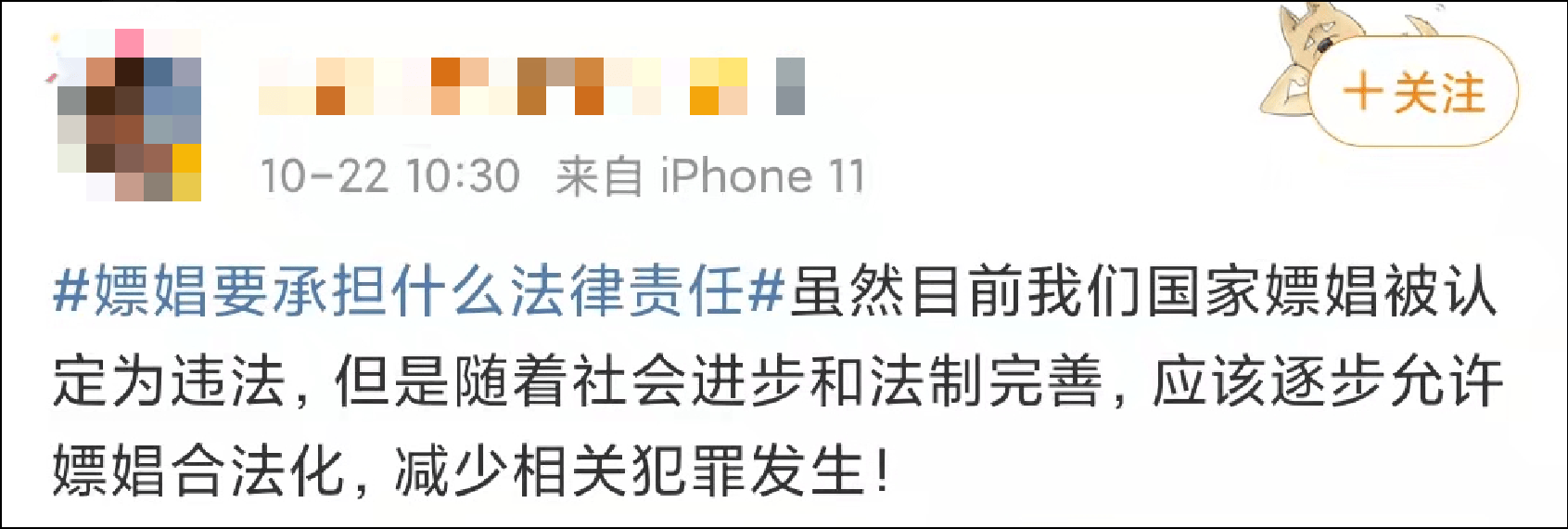 至於嫖娼合法化的問題,不少網友認為,合法化後存在增加“人口拐賣”的風險,還將造成一系列社會問題,並不可取。