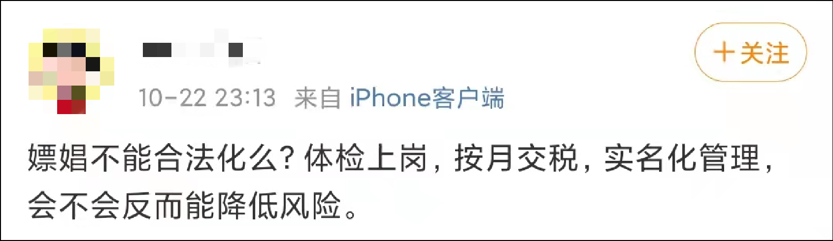 還有人藉由此事提出“嫖娼應該合法化”的觀點,還以“國外早就合法化了”作為理由。