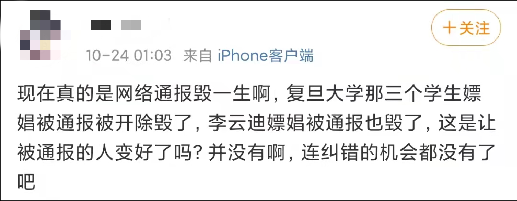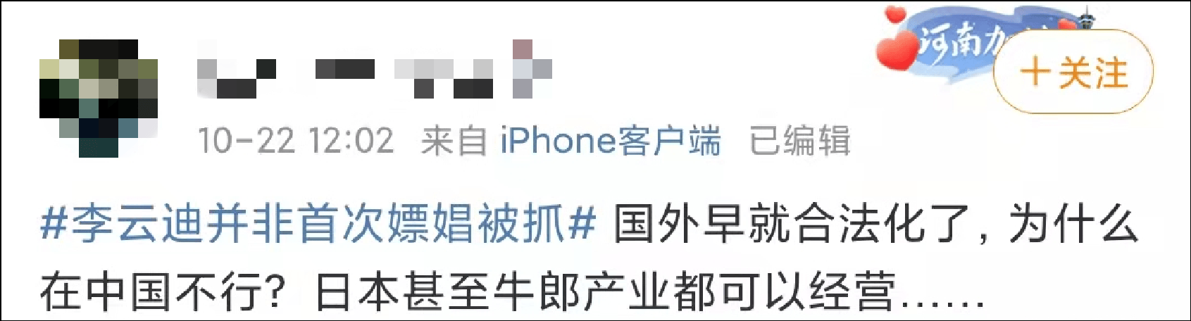 自李雲迪嫖娼事件曝光後,相關爭議持續不斷,不少網友藉由“單身人士有生理需求”“嫖娼不影響他人”等説法開始為李雲迪“洗白”,其中不乏有名人大V甚至境外人士下場,不僅認為警方通報“小題大做”,涉嫌侵犯犯李雲迪的個人隱私,還呼籲起了“嫖娼合法化”。