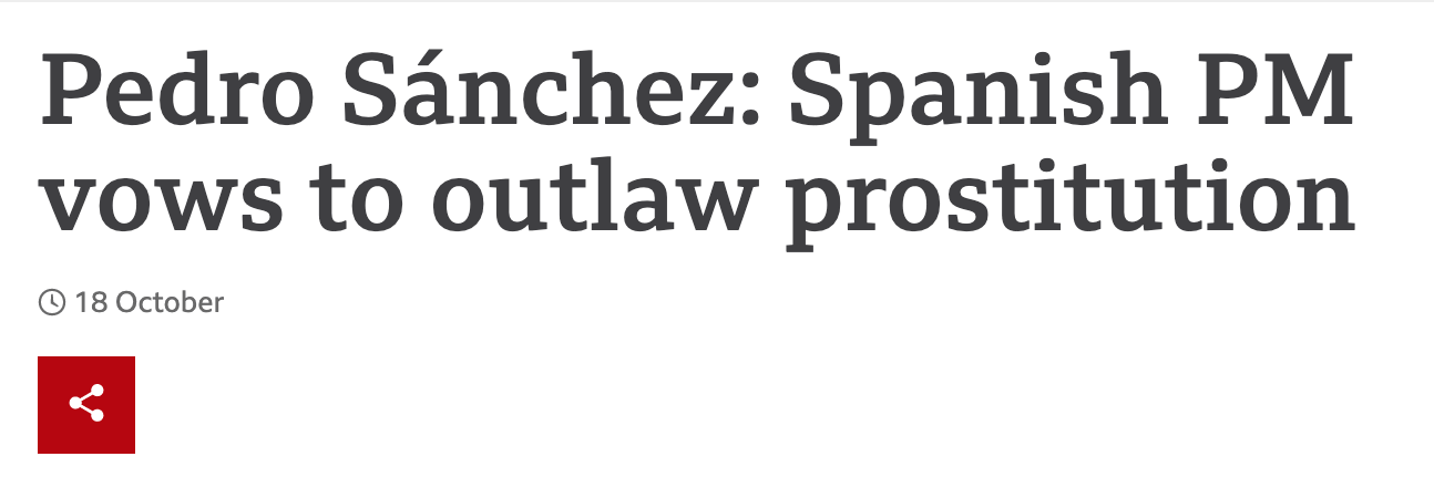 而即便是在性交易合法國家,反對的聲音也從未平息。10月17日,西班牙首相佩德羅·桑切斯就在公開講話中表示計劃取締賣淫,稱賣淫行業是對廣大婦女的奴役。
