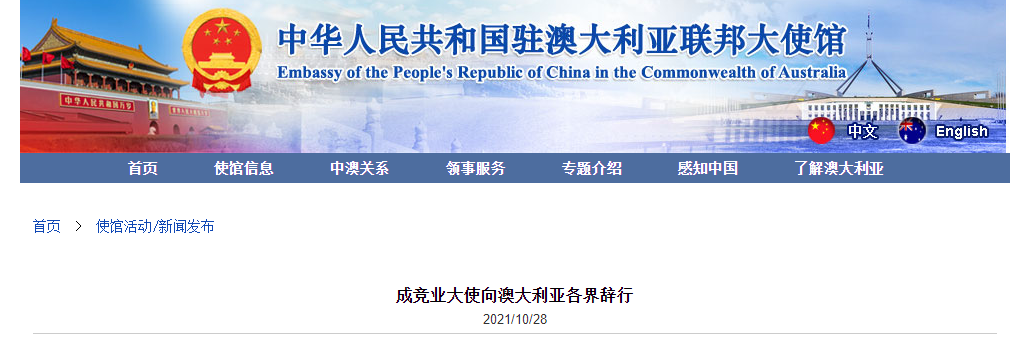 中國駐澳大利亞大使館網站10月28日消息,近日,即將離任的中國駐澳大利亞大使成競業以通話、致函等方式向澳政界、工商界、學界、地方政府及駐澳使團等人士辭行,並與在澳僑胞話別。