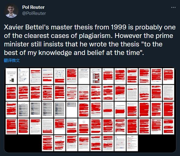 當地時間10月27日,盧森堡新聞網站“記者”(Reporter)曝出關於首相貝泰爾(Xavier Bettel)的學術醜聞,並寫下如此標題。報道稱,在貝泰爾關於歐洲議會的56頁碩士論文中,只有兩頁沒有“大規模”的抄襲。