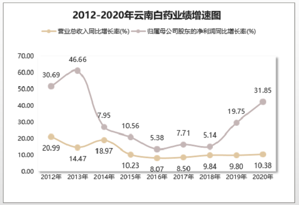 數據顯示,2016年至2020年,雲南白藥營收增速分別為8.07%、8.5%、9.84%、9.8%和10.38%;淨利潤增速分別為5.38%、7.71%、5.14%、19.75%和31.85%。