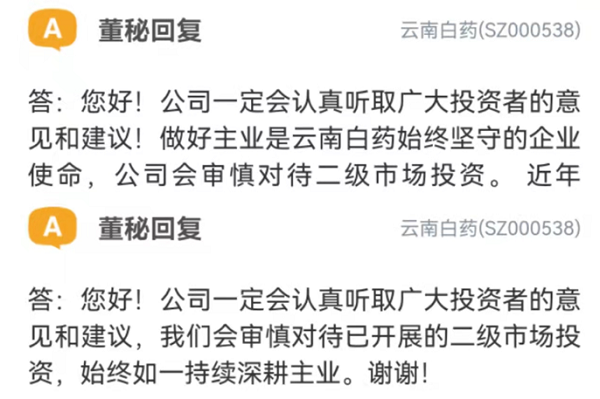 不過今日下午,該公司董秘多次在投資者平台上表示:“公司一定會認真聽取廣大投資者的意見和建議!做好主業是雲南白藥始終堅守的企業使命,公司會審慎對待二級市場投資。”