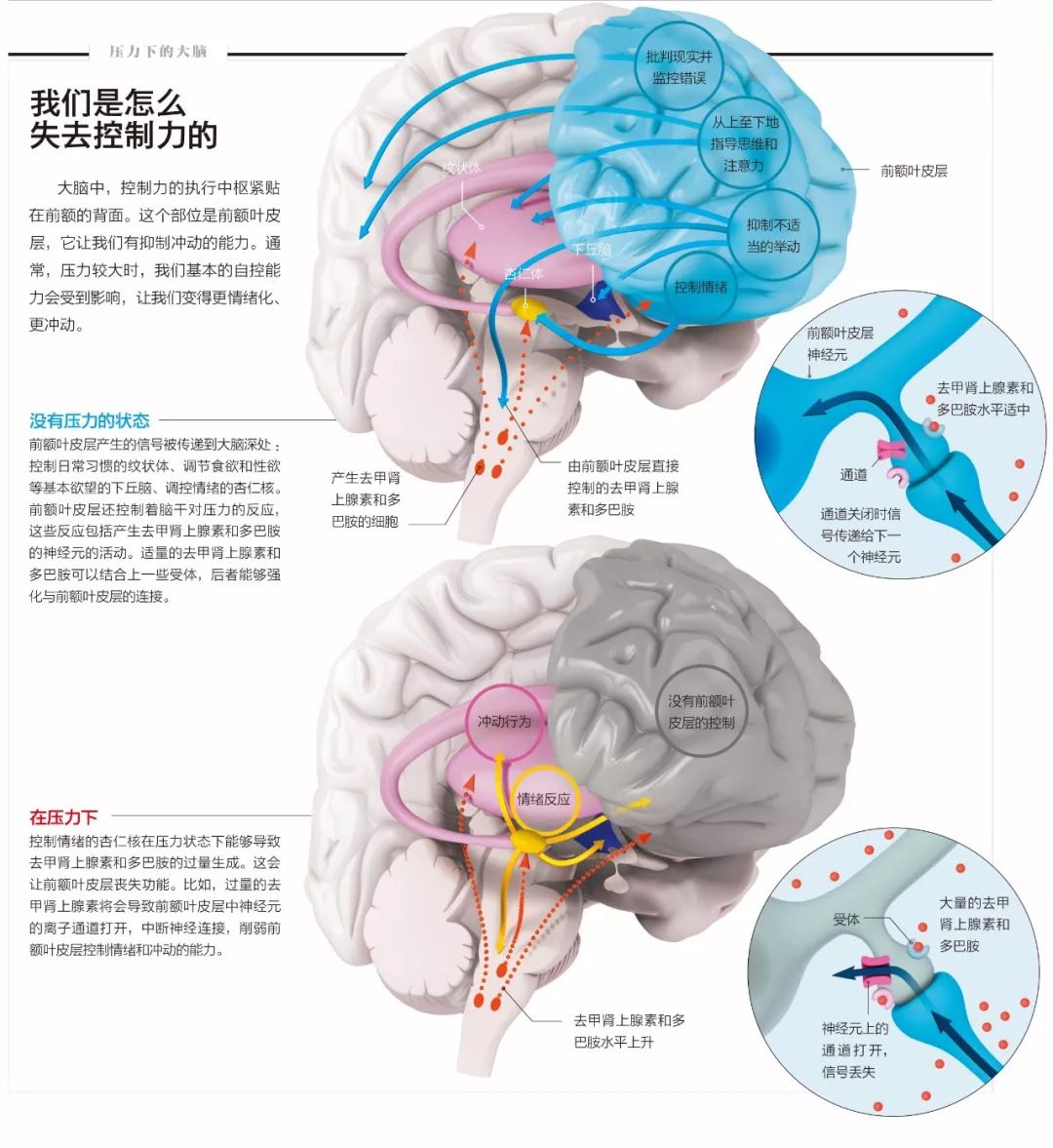 有的時候,人還會突然“喪失理智”,直接為情緒支配。耶魯大學的神經科學家艾米·安斯頓(Amy Arnsten)等發現,面對壓力時,人腦過度釋放各種應激激素,阻礙前額葉調控“杏仁核”等與情緒相關的腦區。