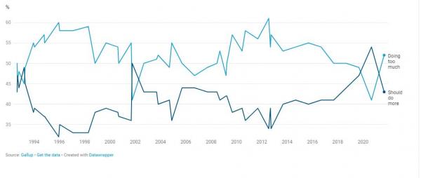 舉個例子,1992年以來,蓋洛普民調一直在調查政府是否應該管更多來解決美國的問題。2020年末,支持者暴漲。歷史上第一次超過半數(54%)的人認為他們想要政府做更多。在歷史上,只有911事件後這個數據出現了高峯,達到了約50%。