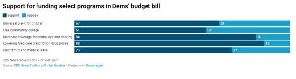 民主黨的政策人士表示,他們的各項議程都很受歡迎,因此應該都通過。不過,對這些政策議程受歡迎程度的調查都是孤立的。調查多次發現,美國人普遍期望擴大託兒所、帶薪休假、免費社區大學、醫保擴張、廉價藥物等等。