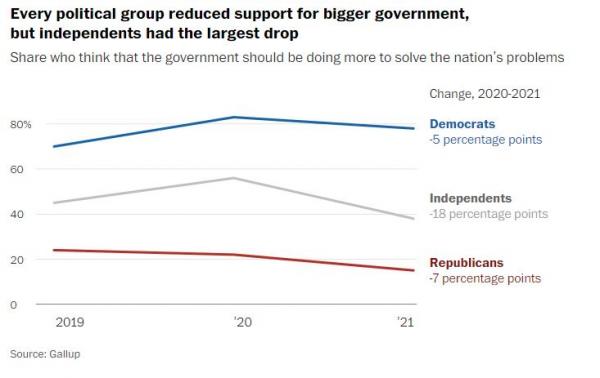 各種政治信念的受訪者,包括民主黨人,都比一年前更少支持積極的政府行動。獨立立場的人下滑最大,2020年還有56%支持政府做更多,現在只有38%了。