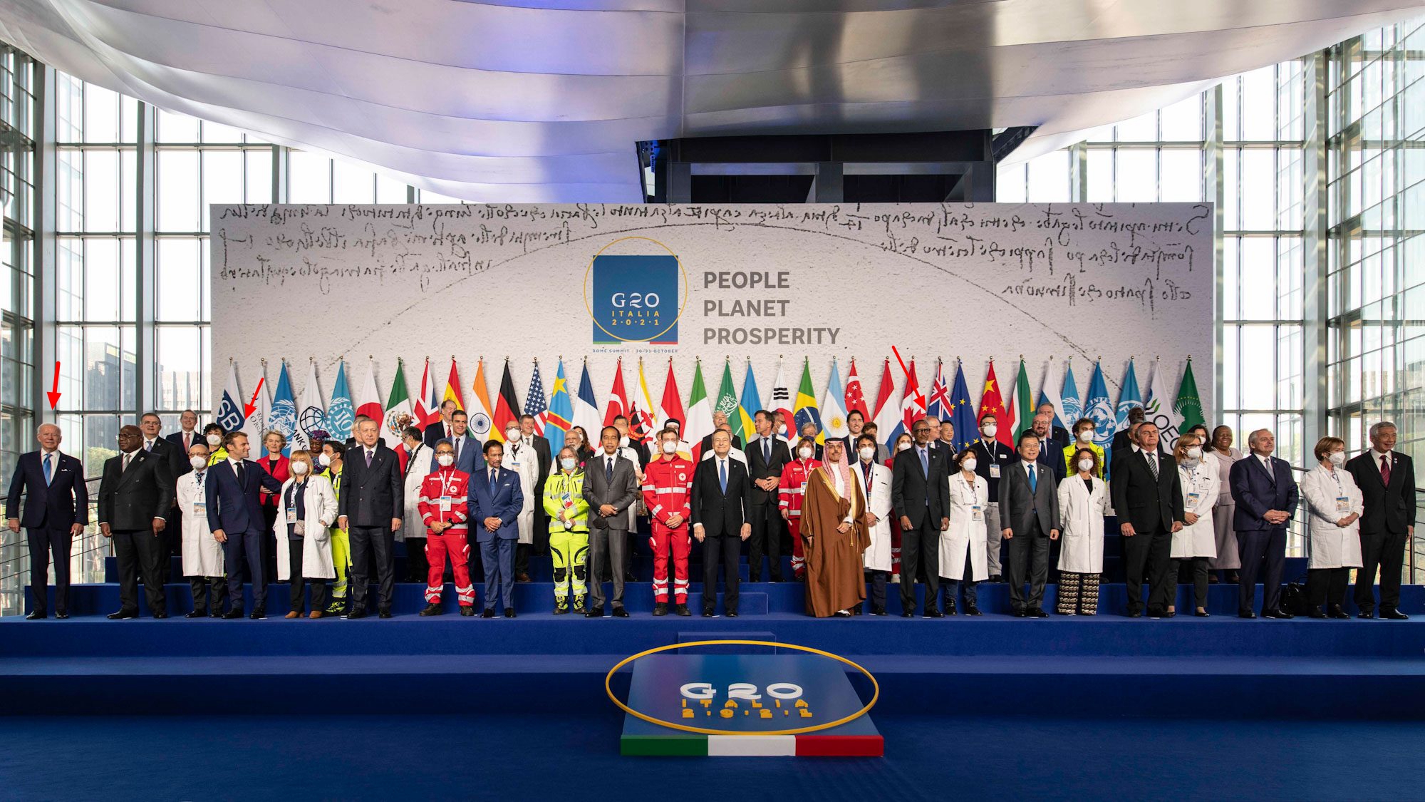G20大合影,箭頭處從左到右依次為拜登、馬克龍、莫里森 圖自官網