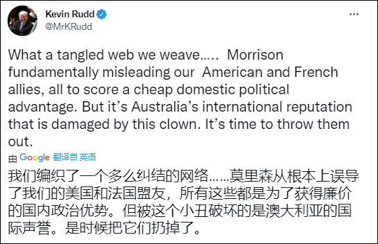 此情此景,澳前總理陸克文看不下去了,他發推特稱:“莫里森從根本上誤導了我們的美國和法國盟友,所有這些都是為了獲得廉價的國內政治優勢。但這個小丑破壞了澳大利亞的國際聲譽。是時候讓他們出局了。”