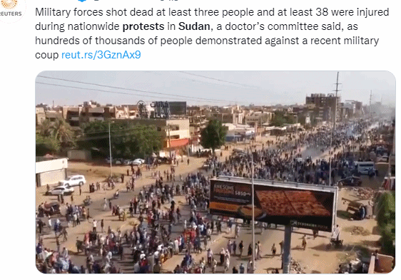 美聯社稱,這是軍事政變以來,蘇丹國內發生的最大規模的抗議活動。一名目擊者告訴路透社,首都喀土穆的抗議人羣一度增至數十萬人。