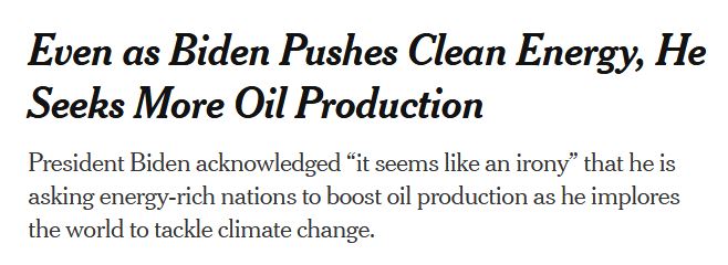 文章以拜登的發言為例,稱他一方面在氣候變化大會上呼籲減少化石燃料的使用,一方面又在稍早之前督促主要能源生產國提高產量。就連他自己都承認:這樣看起來有點諷刺。
