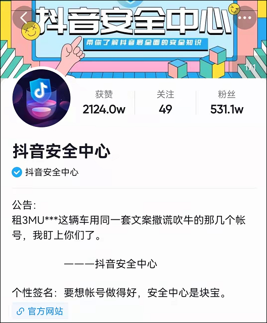 到了今日,博主@慫的載體 注意到,抖音安全中心的官方賬號已在其主頁發佈公告,內容直指租那輛白色保時捷的抖音賬號:“租3MU***這輛車用同一套文案撒謊吹牛的那幾個賬號,我盯上你們了。”