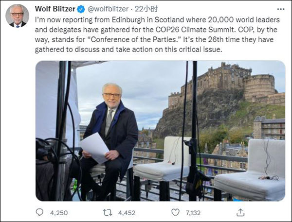 “我目前在位於蘇格蘭的愛丁堡進行報道,兩萬名世界領袖與代表在此齊聚一堂參加COP26氣候峯會。順便一提,COP意為“締約方大會”,這已是他們第26次聚在一起討論(氣候)這一關鍵問題並採取行動了。”當地時間11月1日,CNN“6-9am ET”節目的主播沃爾夫·布利策(Wolf Blitzer)的推文及其配圖吸引了網友們的眼球。