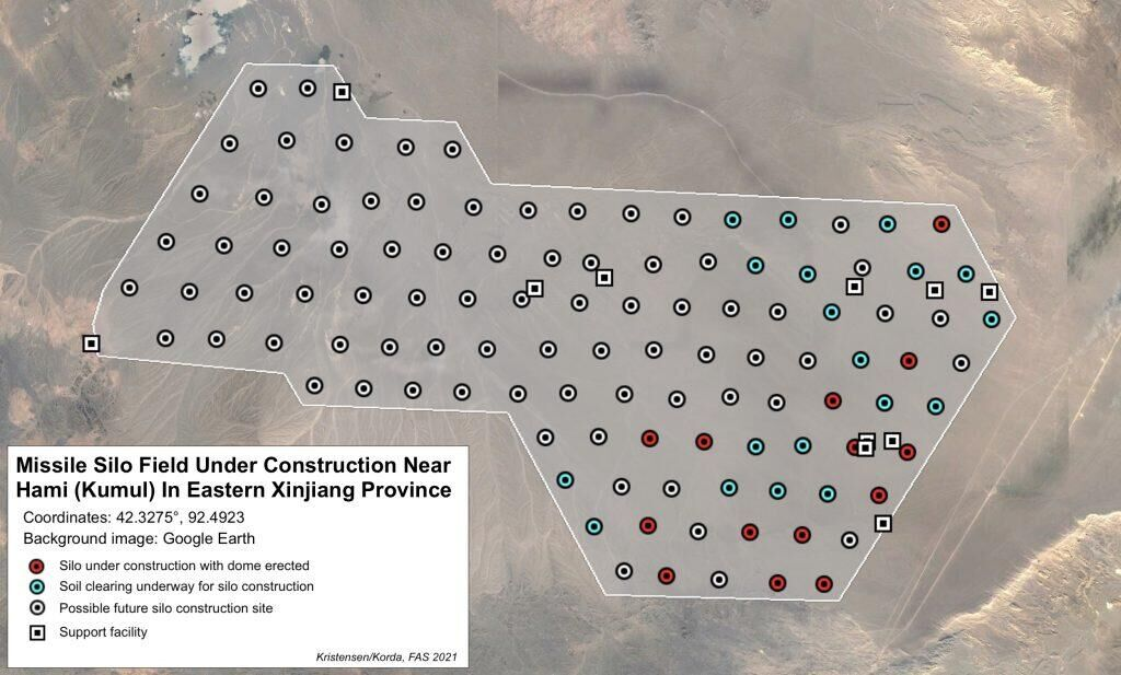 除了渲染中國高超音速武器以外,今年7月《華盛頓郵報》宣稱找到我國在“玉門建造的110個導彈發射井”。隨後,美國有線電視新聞網(CNN),《紐約時報》又援引智庫人士的話稱,我國哈密等地區“又建造了200多個發射核導彈的發射井”,這使得中國在建核彈井數量達到350個。