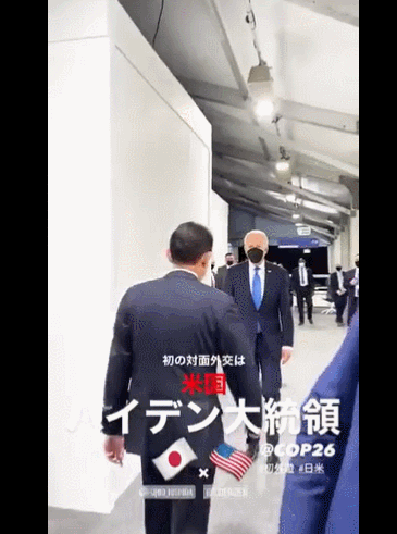 11月2日,岸田文雄在英國格拉斯哥第一次見到拜登,二人親切碰肘,並短暫談話。岸田和拜登確認了保持密切合作,加強兩國同盟關係,應對氣候挑戰,並實現所謂的“自由開放的印太地區”。
