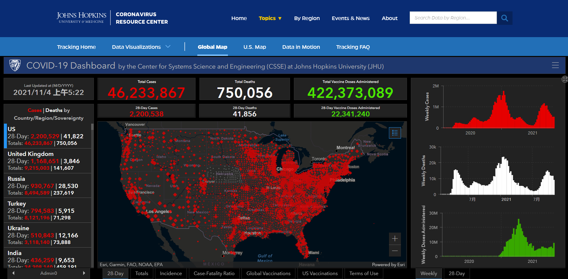 (觀察者網訊)根據美國約翰斯·霍普金斯大學統計數據,截至北京時間2021年11月4日5時22分,美國新冠肺炎累計確診病例達46233867例,累計死亡病例750056例。在過去25小時裏,美國新增確診病例93358例,新增死亡病例1883例。