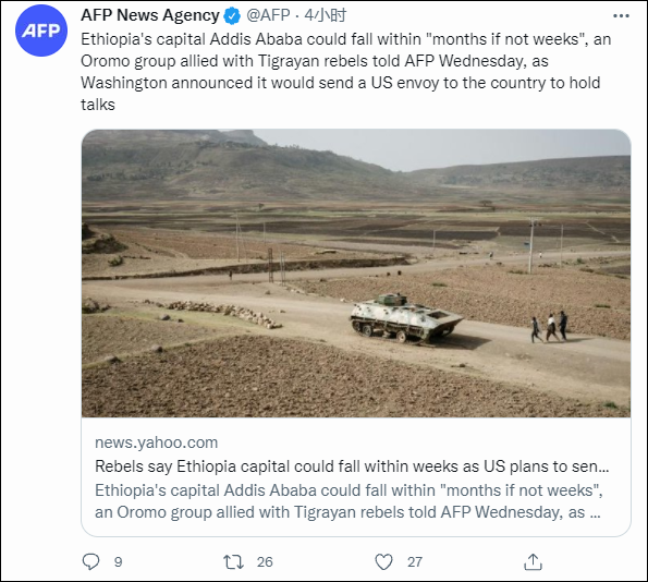 法新社稱,埃塞俄比亞不斷升級的內戰衝突引起了國際社會的關注,聯合國秘書長安東尼奧·古特雷斯(Antonio Guterres)和幾個西方大國也呼籲該國立即停火,並進行和平談判。據聯合國的信息,這場戰爭已造成數千人死亡,並迫使數十萬人陷入饑荒等災難中。
