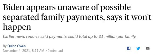 幾天前,美國《華爾街日報》曾報道稱,“對於在特朗普政府時期在美國邊境與家人分離的移民,拜登政府正考慮向他們每人提供45萬美元(約合288萬人民幣)補償”,這一消息隨即引發了共和黨政客的“吐槽”。此外,許多美國民眾也被“破防”,原因是這一補償金額可能會超過向“911”恐怖襲擊事件遇難者家屬提供的費用。