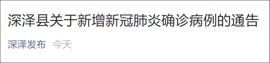 11月5日,“深澤發佈”微信公眾號發佈深澤縣關於新增新冠肺炎確診病例的通告,全文如下: