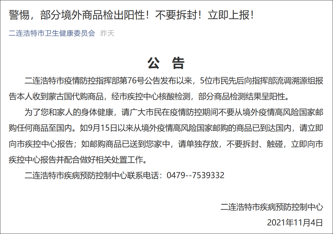 二連浩特市疫情防控指揮部第76號公告發布以來,5位市民先後向指揮部流調溯源組報告本人收到蒙古國代購商品,經二連浩特市疾控中心核酸檢測,部分商品檢測結果呈陽性。