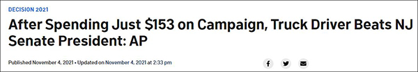 作為一位名不見經傳的卡車司機,愛德華·杜爾(Edward Durr)以共和黨新人的身份出人意料地擊敗了該州民主黨“大佬”——長期擔任州參議院議長的史蒂夫·斯威尼(Steve Sweeney),成功當選新一任州議員。而杜爾在選舉過程中的花費,僅為153.31美元(約合981元人民幣)。
