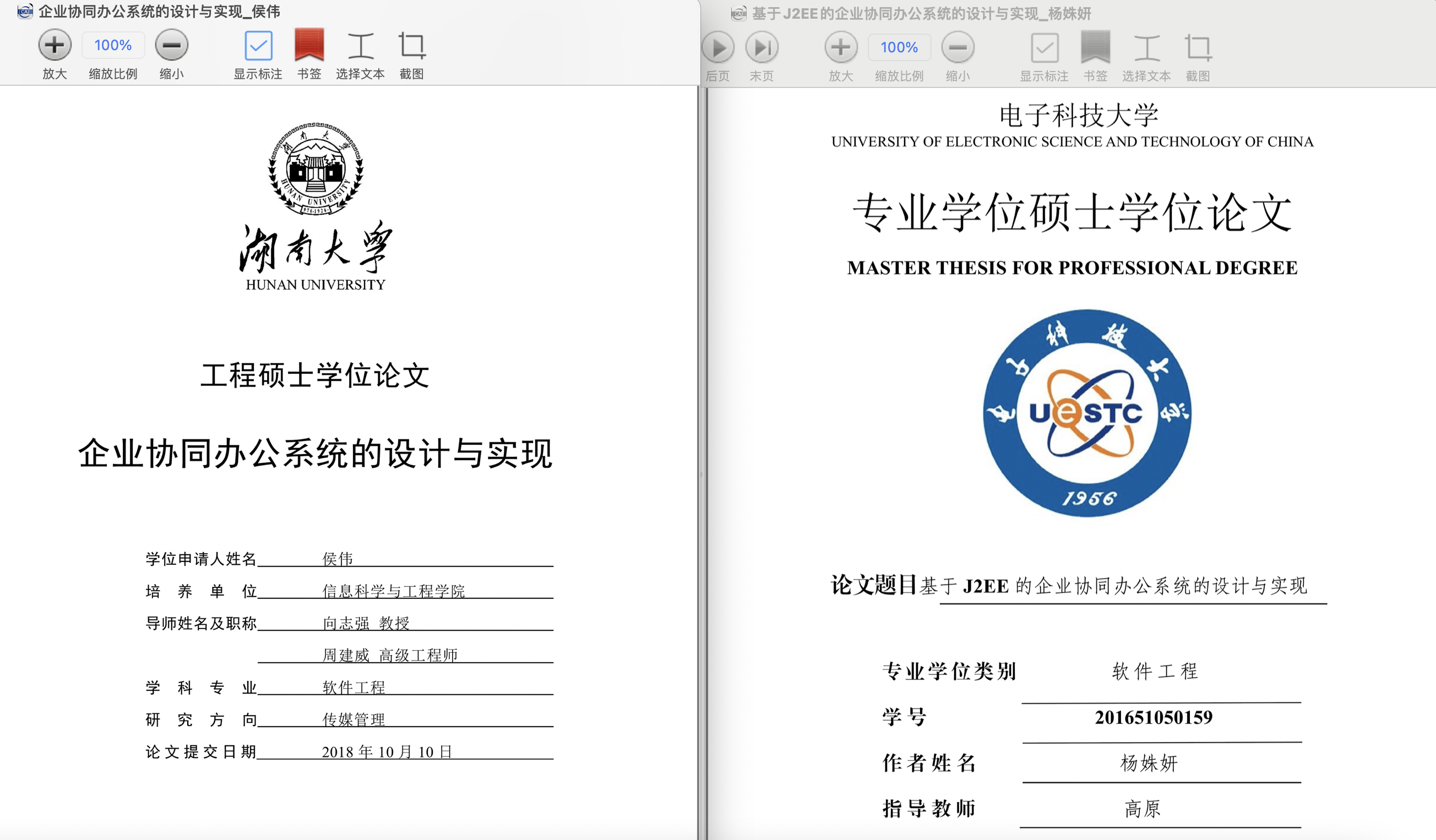 湖南大學侯偉的碩士學位論文封面(左),電子科技大學楊姝妍的碩士學位論文封面(右)。 論文截圖