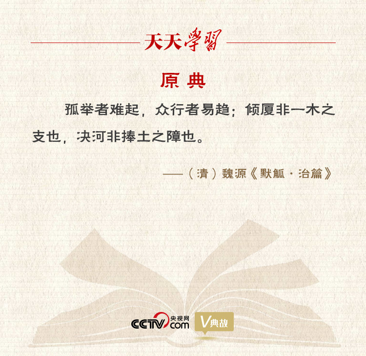 “孤舉者難起,眾行者易趨”,出自清代啓蒙思想家魏源的《默觚·治篇》。《默觚》分《學篇》《治篇》兩部分,集中反映了魏源的哲學思想。“默”取自魏源的字“默深”,“觚”為古代用來書寫的木簡。
