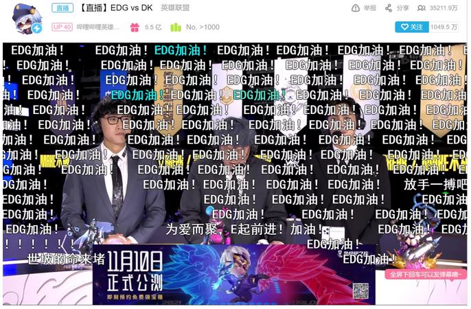 《英雄聯盟》全球總決賽吸引了全球觀眾的目光,11月6日晚,僅在bilibili平台,S11總決賽的直播便吸引了3.5億人氣,滿屏EDG加油的彈幕也能看出觀眾的熱情。