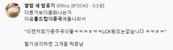 “比起別的,有點生氣的是,下次英雄聯盟比賽的時候,中國孩子們出來:‘現在我們是宗主國了呵呵呵呵呵呵呵LCK王朝已經不存在了。哈哈哈。’一想到這個就有點煩。”