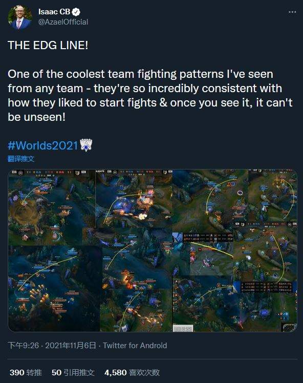 《英雄聯盟》官方解説Isaac CB在推特上大力稱讚EDG:“EDG對線!這是我在所有隊伍中,看過最酷的團戰模式。他們在開團方面有着難以置信的一致性。一旦看到,就難以令人忘懷!”