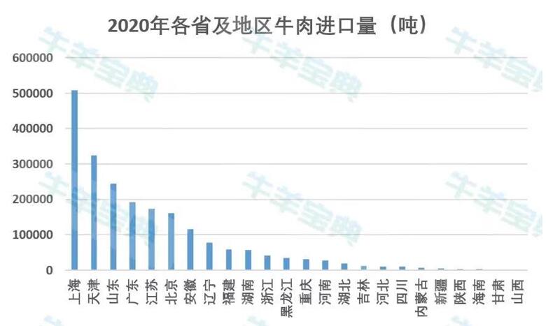 2020年進口牛肉的省(地區、市)共29個,年進口總量合計超過1,000噸的有24個,它們分別是上海(5,081,46.33噸)、天津(324,423.89)、山東(243,844.62)、廣東(192,954.93)、江蘇(17,2362.45)、北京(16,0546.02)、安徽(11,5619.22)、遼寧(78,030.13)、福建(57,788.91)、湖南(57,512.33)、浙江(40,513.52)、黑龍江(34,231.98)、重慶(31,395.09)、河南(26,973.63)、湖北(18,408.96)吉林(12,327.72)、河北(10,633.08)、四川(10,286.22)、內蒙古(6,980.87)、新疆(5,226.49)、陝西(2,671.43)、海南(2,269.82)、甘肅(1,669.25)、山西(1,467.16)。
