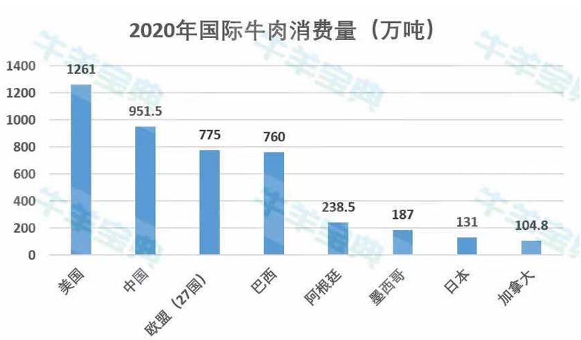 2020年牛肉出口總量超過30萬噸的國家/地區)有:巴西(255.0萬噸)、澳大利亞(142.5)、美國(131.4)、阿根廷(81.0)、新西蘭(61.0)、加拿大(50.0)、墨西哥(36.0)、歐盟(27國)(35.0)