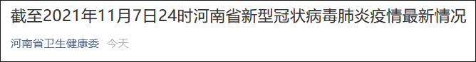 據微信公號“河南省衞生健康委”11月8日消息,11月7日0—24時,河南全省新增本土確診病例18例(鄭州市16例,含無症狀感染者轉確診病例13例;周口市2例,含無症狀感染者轉確診病例1例),新增本土無症狀感染者7例(鄭州市7例);新增境外輸入無症狀感染者1例;無新增疑似病例;2例境外輸入確診病例治癒出院,1例境外輸入無症狀感染者解除醫學觀察。