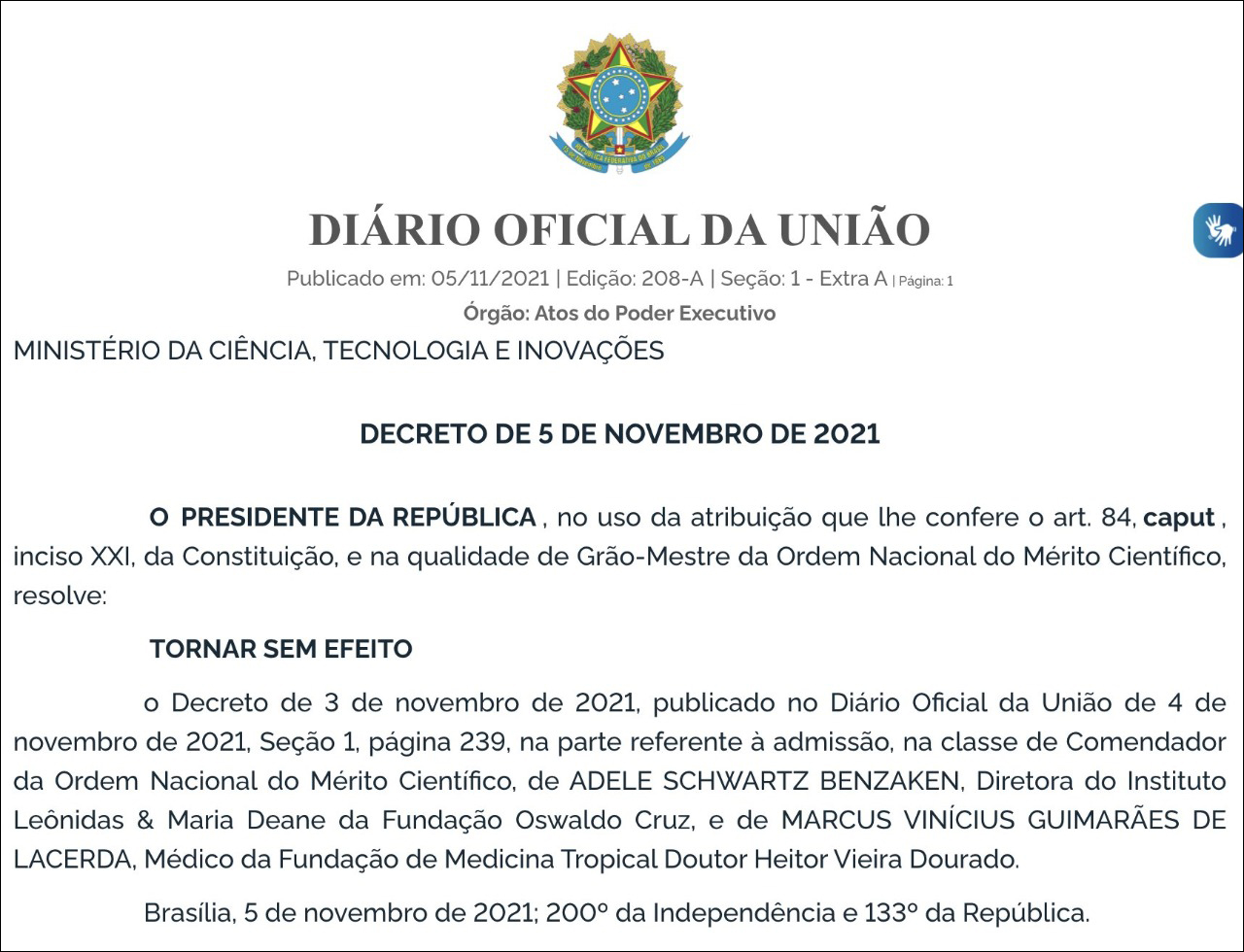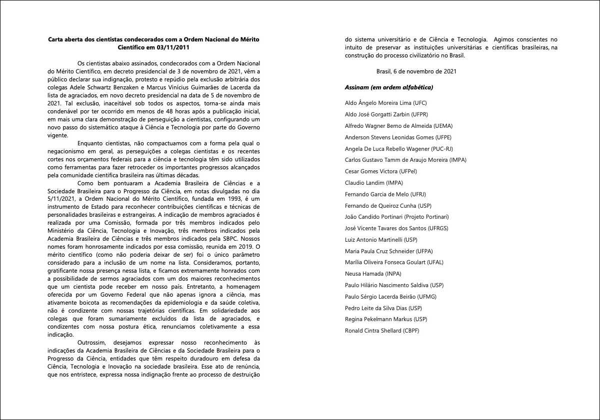 11月3日,巴西總統博索納羅公佈了獲得“國家科學功績勳章”的人員名單,然而兩天後(11月5日),他卻下令將兩名曾批評政府應對疫情不力的科學家從名單中剔除。