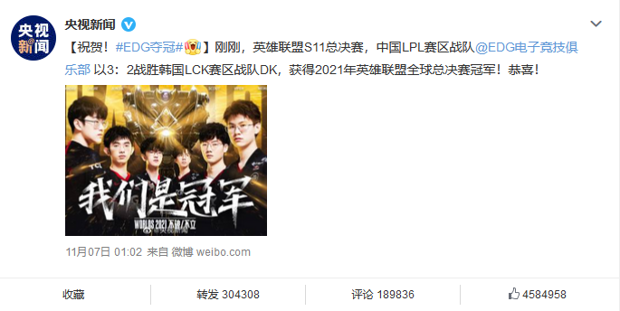 而在國內外社交平台上,這場比賽亦引發巨大反響。微博上,“EDG奪冠”上了熱搜第一,閲讀量迅速躥破30億,@央視新聞的祝賀微博轉發也已超過30萬;國外社交媒體上,包括韓國遊戲玩家在內,很多人驚呼比賽“令人窒息”,官方解説則稱讚EDG技戰術水平高超。