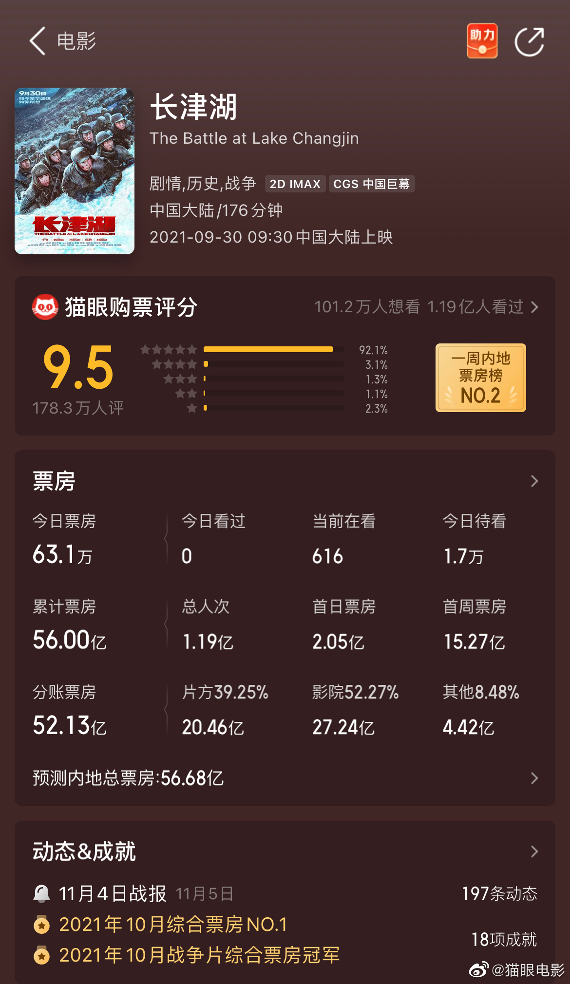 另據@貓眼電影 消息,貓眼專業版實時見證11月9日10:08:56,電影《長津湖》總票房破56億!距離中國影史票房榜冠軍《戰狼2》創造的票房紀錄只有不到1億元的差距。