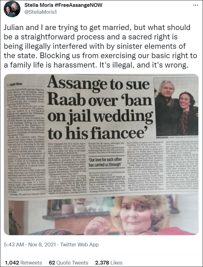 阿桑奇和未婚妻莫里斯已經訂婚5年,共同育有兩個孩子。自今年5月以來,他們多次請求在監獄舉行結婚儀式,但沒有得到任何回應。