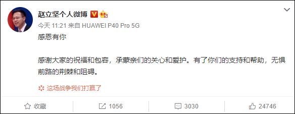 同日,趙立堅的微博賬號@趙立堅個人微博 也發文稱:“感恩有你。感謝大家的祝福和包容,承蒙親們的關心和愛護。有了你們的支持和幫助,無懼前路的荊棘和阻礙。 ”