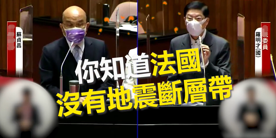 蘇貞昌接着竟用嚴厲語氣反問:“那你知道法國沒有地震斷層帶,你知道嗎?”羅明才當場語塞,愣了約5秒鐘。其後,蘇貞昌又繼續聲稱,“法國沒有地震帶,台灣有地震斷層帶,而法國旁邊的德國在總理默克爾時代已經是零核電”,以此進一步反駁羅明才的提議。