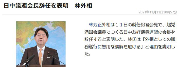 據日本時事通訊社今天上午(11日)消息,日本新任外務大臣林芳正當天在就任的記者會上表示要辭去中日友好議員聯盟會長一職。