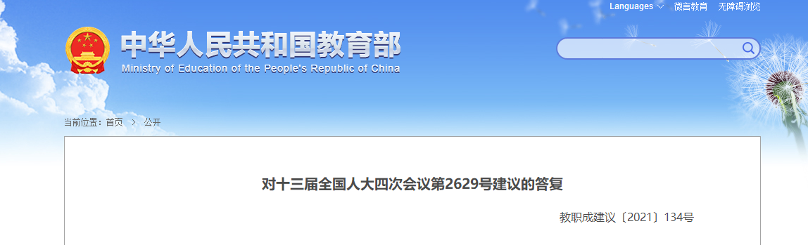 教育部網站消息,近日,教育部就十三屆全國人大四次會議第2629號建議進行答覆稱,教育部將繼續貫徹落實黨中央對於職業教育改革的政策部署,進一步強化中等職業教育基礎作用,規範長學制技術技能人才貫通培養,嚴格執行技能拔尖人才免試入學條件,逐步建立“職教高考”制度,使中職畢業生享有更多樣的教育選擇和更暢通的學業提升通道。