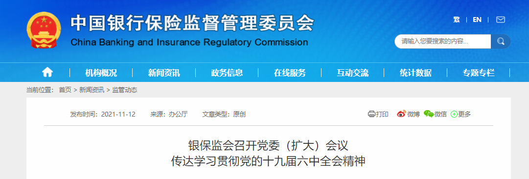 中國銀保監會網站消息,11月12日下午,銀保監會黨委書記、主席郭樹清主持召開黨委(擴大)會議,傳達學習貫徹黨的十九屆六中全會和習近平總書記重要講話精神,結合銀保監會實際,研究部署學習貫徹意見。