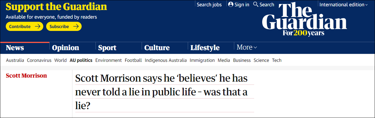 而英國《衞報》則在報道此事的同時又直接單開一篇報道,羅列了5個莫里森涉及“虛假或不正確發言”的話題,併發問:莫里森説,他“相信”自己在公眾生活中從未撒過謊——那這是個謊言嗎?